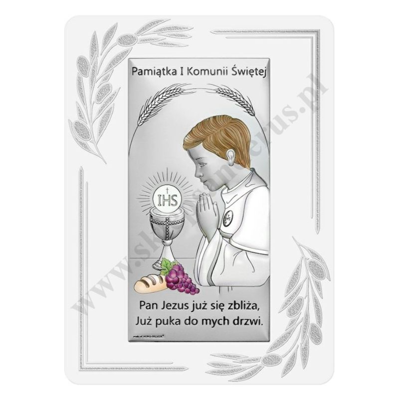 Srebrny obrazek, koloryzowany przedstawiający chłopca przyjmującego I Komunię Świętą. Rozmiar obrazka 9.5 x 13 cm. PONIŻEJ W PRODUKTACH POWIĄZANYCH ISTNIEJE MOŻLIWOŚĆ ZAMÓWIENIA OKAZJONALNEJ DEDYKACJI NA TABLICZCE LUB REWERSIE OBRAZKA.