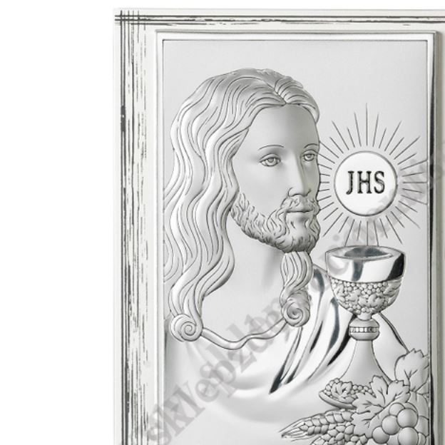 Srebrny obrazek na białym, zdobionym drewnie przedstawiający Pana Jezusa Eucharystycznego. Rozmiar obrazka 9 x 13.5 cm. PONIŻEJ W PRODUKTACH POWIĄZANYCH ISTNIEJE MOŻLIWOŚĆ ZAMÓWIENIA OKAZJONALNEJ DEDYKACJI NA TABLICZCE LUB REWERSIE OBRAZKA.