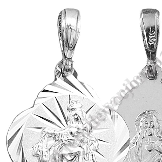 Srebrny medalik diamentowany przedstawiający Matkę Bożą Szkaplerzną i Serce Pana Jezusa o wysokości z uszkiem 2.7 cm, szerokości 1.7 cm, wadze 2.1 g, próba srebra PR 925.