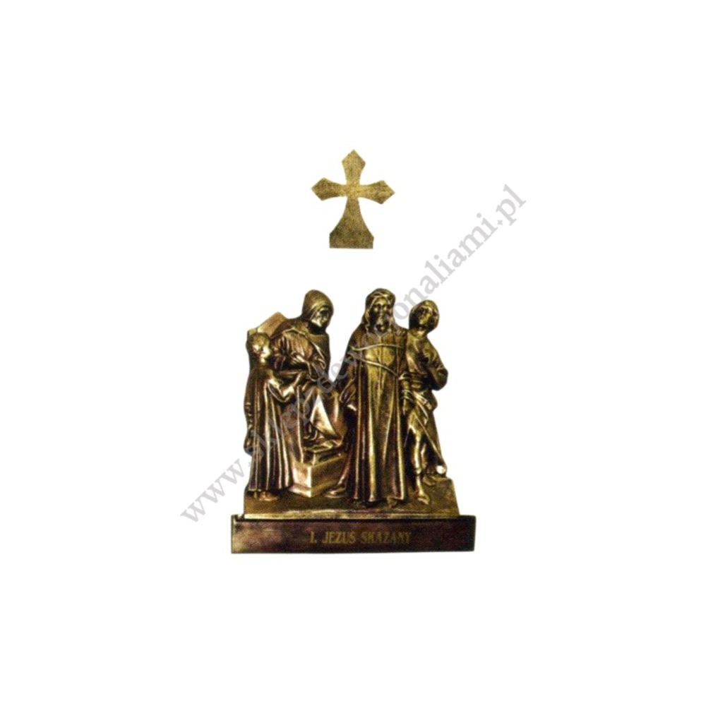 Komplet figur Stacji Drogi Krzyżowej wykonanych z żywicy epoksydowej w kolorze patyny złotej.