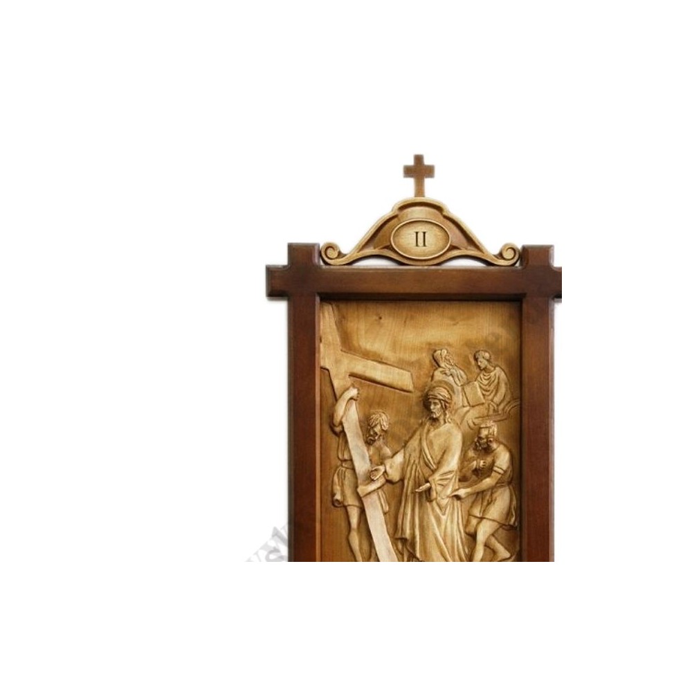 Komplet Stacji Drogi Krzyżowej precyzyjne wykonanych w drewnie lipowym. Wysokość 51 cm, szerokość 35 cm.