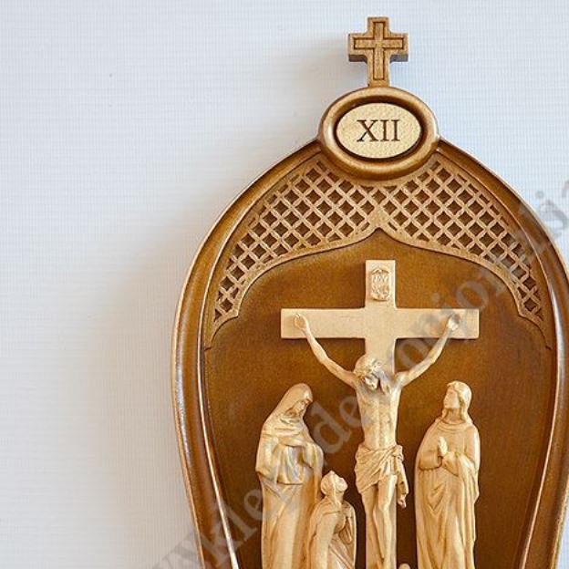 Komplet Stacji Drogi Krzyżowej precyzyjne wykonanych w drewnie lipowym. Wysokość 29 cm, szerokość 17 cm.