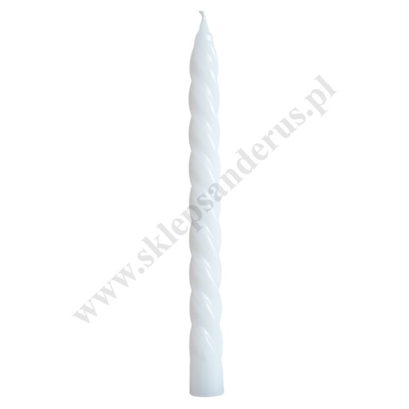 Świeca stołowa, kręcona o wysokości 21.5 cm i średnicy ok. 2 cm.