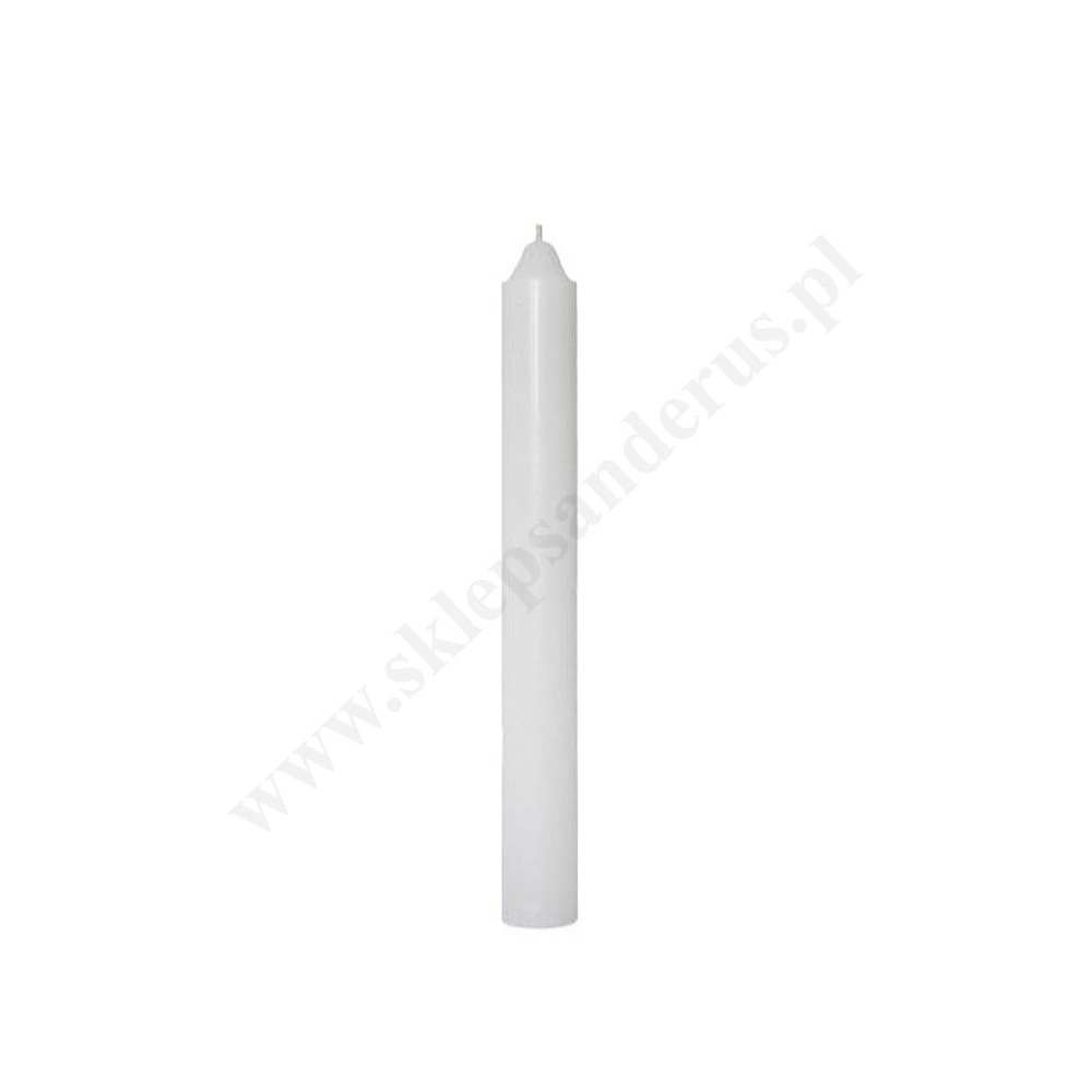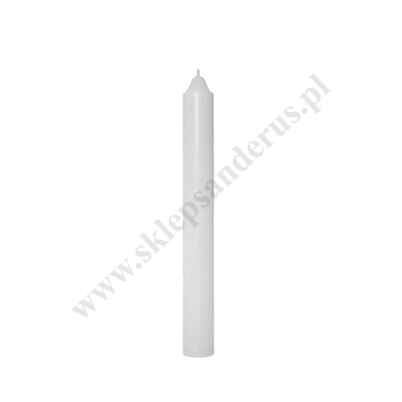 Parafinowa biała świeca stołowa o wysokości 16 cm i średnicy 1.8 cm.