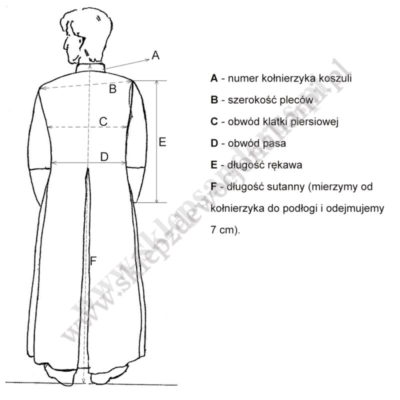Przy składaniu zamówienia prosimy o wybór rozmiaru sutanny w opcjach po prawej stronie oraz dodatkowo prosimy o podanie dodatkowych wymiarów w komentarzu do zamówienia, według schematu pokazanego na powyższym rysunku.