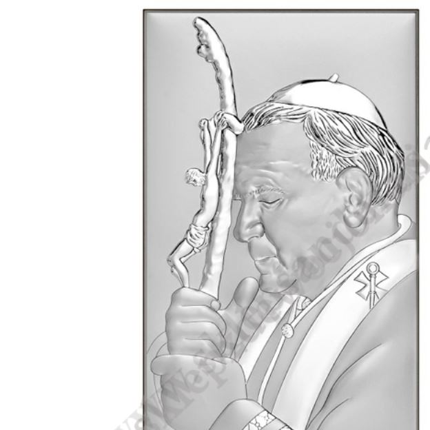 Obrazek srebrny przedstawiający Świętego Jana Pawła II. Rozmiar obrazka: 10 x 20 cm. PONIŻEJ W PRODUKTACH POWIĄZANYCH ISTNIEJE MOŻLIWOŚĆ ZAMÓWIENIA OKAZJONALNEJ DEDYKACJI NA TABLICZCE LUB REWERSIE OBRAZKA.