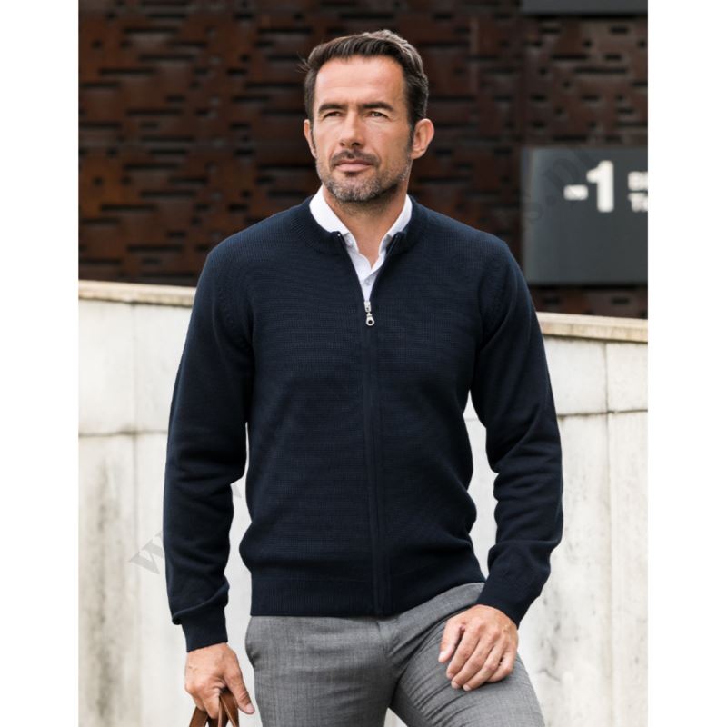 Sweter męski w kolorze ciemny granat rozpinany przez całą długość na zamek błyskawiczny. Sweterek ma ciekawy wzór strukturalny z przodu. Ściągacze u dołu swetra i na rękawach. Ten model swetra idealnie nadaje się na lekko chłodniejsze dni.