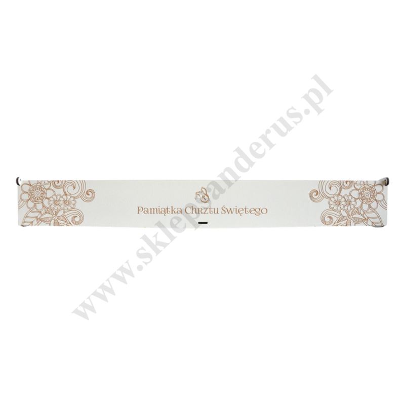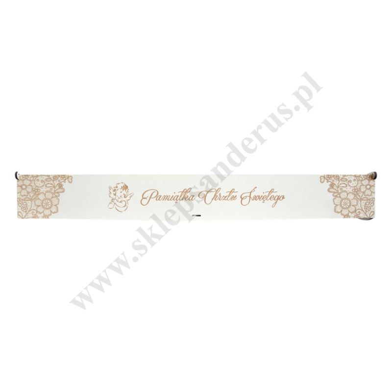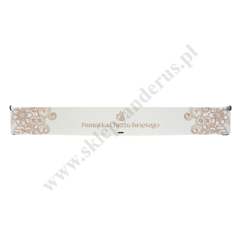 Pamiątkowe pudełko na świecę do chrztu, wykonane ze sklejki z możliwością personalizacji w postaci pamiątkowego graweru. Długość pudełka 46.6 cm, szerokość 5.9 cm, wysokość 5.5 cm. Sprzedaż w miksie wzorów.