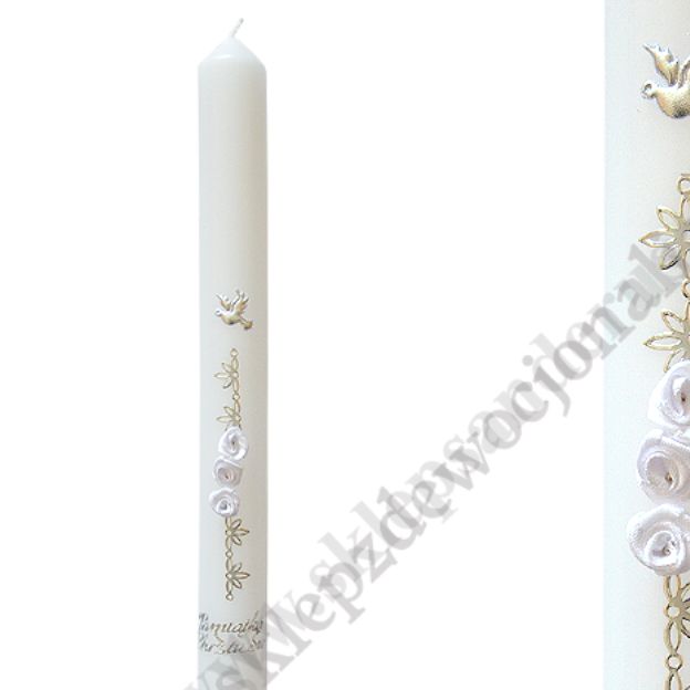 Świeca do chrztu o wysokości 40 cm i średnicy 3 cm. Zapakowana w kartonowe pudełko.