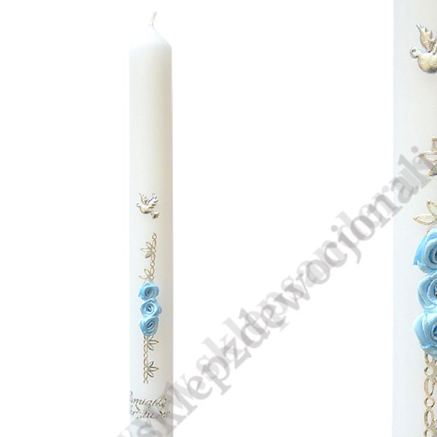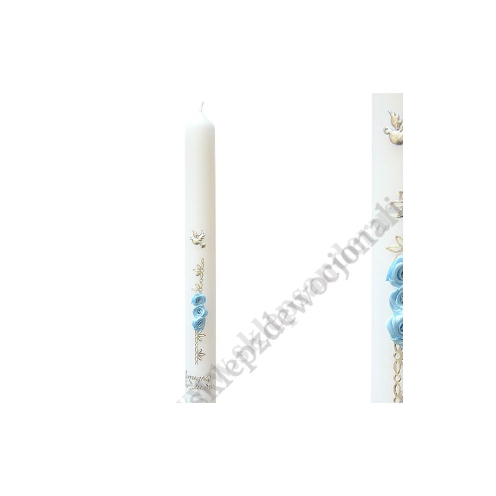 Świeca do chrztu o wysokości 40 cm i średnicy 3 cm. Zapakowana w kartonowe pudełko.