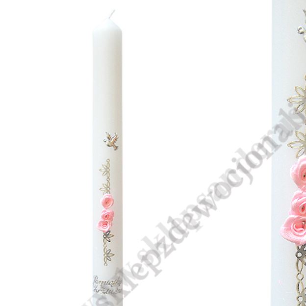 Świeca do chrztu o wysokości 40 cm i średnicy 3 cm. Zapakowana w kartonowe pudełko.