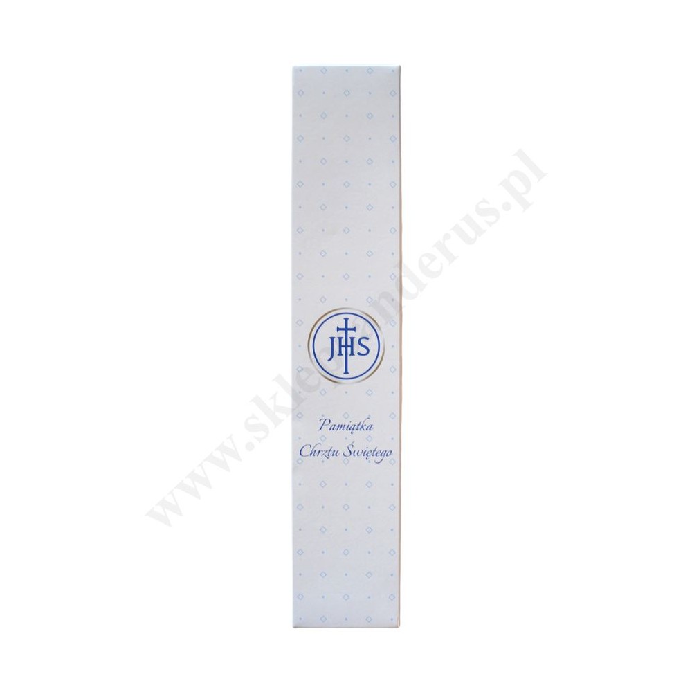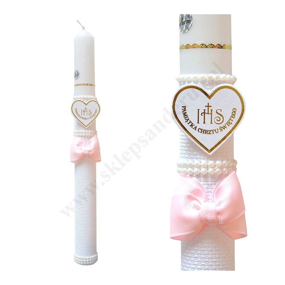 Świeca do chrztu, zdobienia w kolorze złotym, białym i różowym, parafinowa o długości 35 cm i średnicy 3.3 cm, zapakowana w kartonowe pudełko, do zestawu dołączone są literki pozwalające na wypisanie imienia dziecka oraz np. daty chrztu świętego.