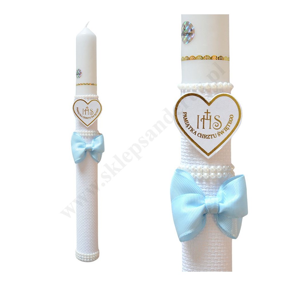 Świeca do chrztu, zdobienia w kolorze złotym, białym i niebieskim, parafinowa o długości 35 cm i średnicy 3.3 cm, zapakowana w kartonowe pudełko, do zestawu dołączone są literki pozwalające na wypisanie imienia dziecka oraz np. daty chrztu świętego.