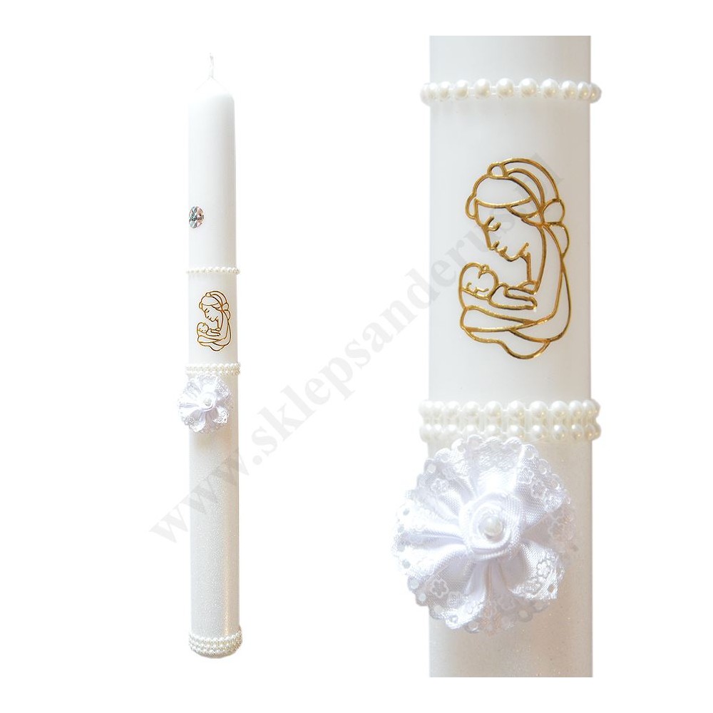 Świeca do chrztu, zdobienia w kolorze złotym i białym, parafinowa o długości 40 cm i średnicy 3 cm, zapakowana w kartonowe pudełko, do zestawu dołączone są literki pozwalające na wypisanie imienia dziecka oraz np. daty chrztu świętego.