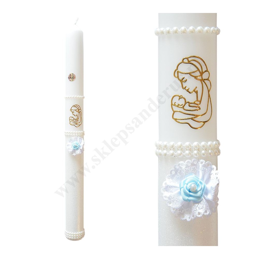 Świeca do chrztu, zdobienia w kolorze złotym i białym, parafinowa o długości 40 cm i średnicy 3 cm, zapakowana w kartonowe pudełko, do zestawu dołączone są literki pozwalające na wypisanie imienia dziecka oraz np. daty chrztu świętego.