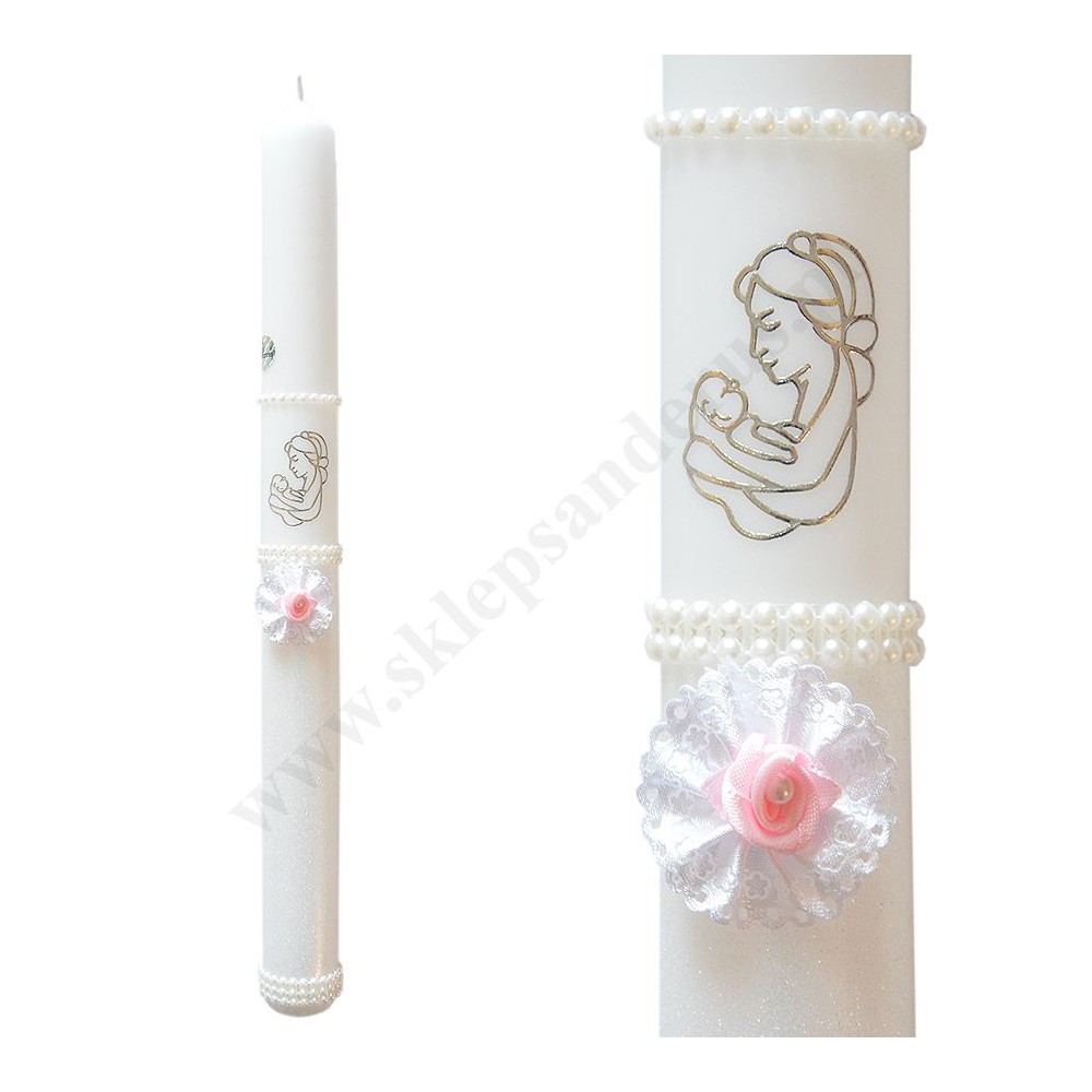 Świeca do chrztu, zdobienia w kolorze srebrnym i białym, parafinowa o długości 40 cm i średnicy 3 cm, zapakowana w kartonowe pudełko, do zestawu dołączone są literki pozwalające na wypisanie imienia dziecka oraz np. daty chrztu świętego.