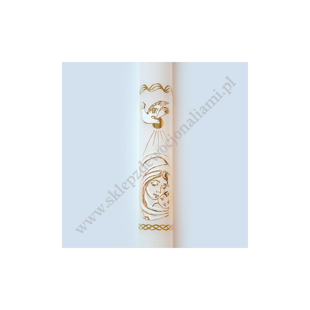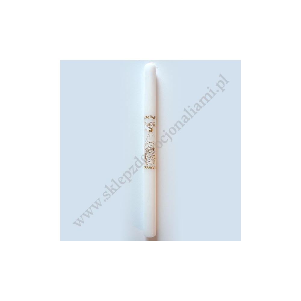 Świeca do chrztu, zdobiona kalkomanią, parafinowa o długości 42 cm i średnicy 3 cm, zapakowana w kartonowe pudełko.