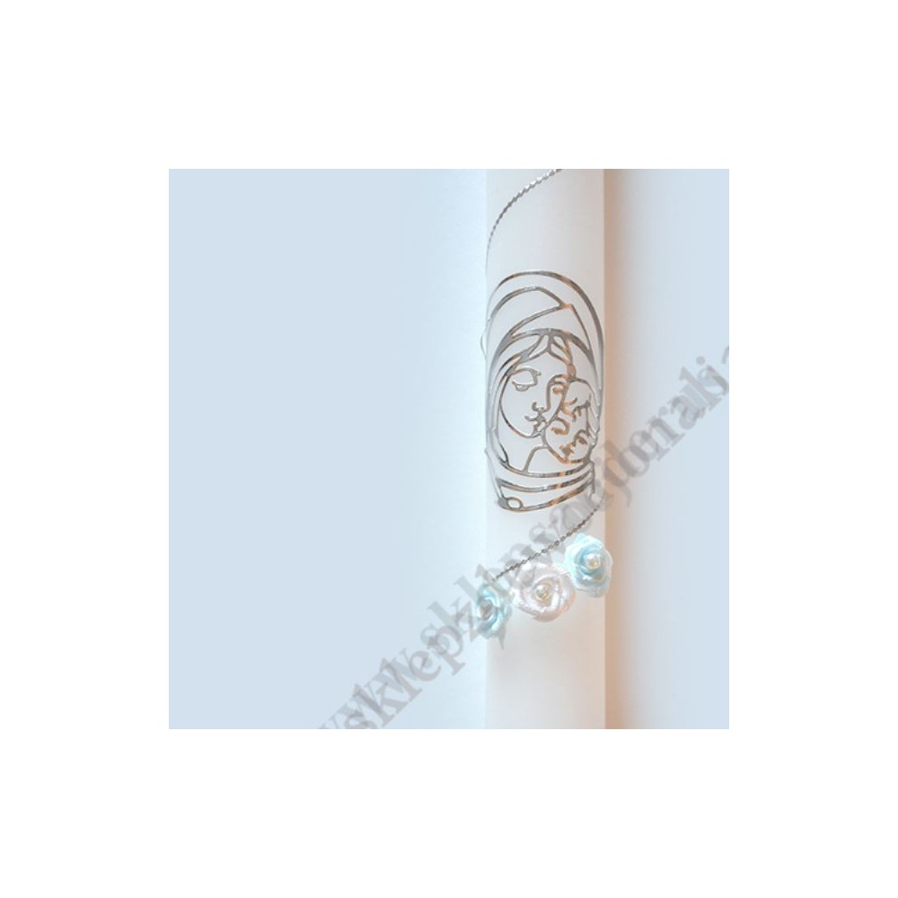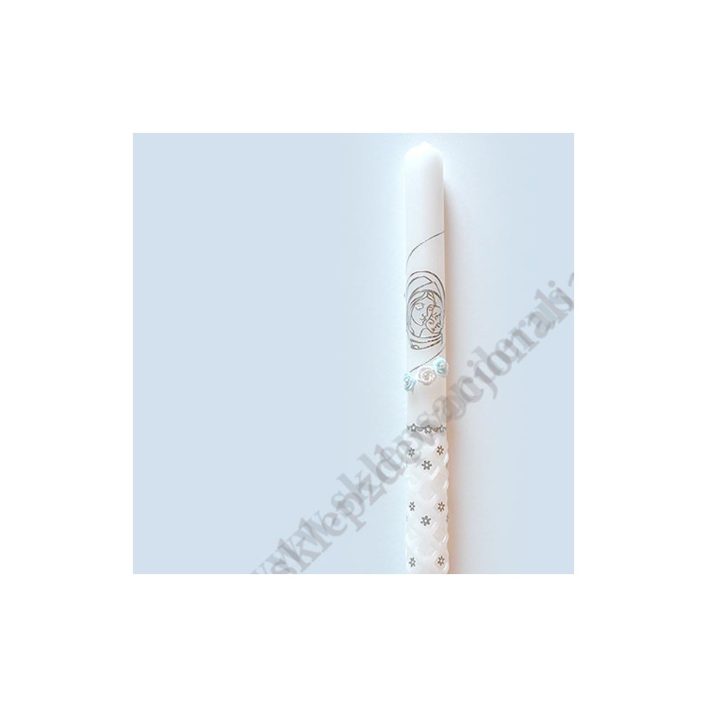 Świeca do chrztu, zdobienia w kolorze srebrnym, białym i niebieskim, parafinowa o długości 42 cm i średnicy 3 cm, zapakowana w kartonowe pudełko, do zestawu dołączone są literki pozwalające na wypisanie imienia dziecka oraz np. daty chrztu świętego.