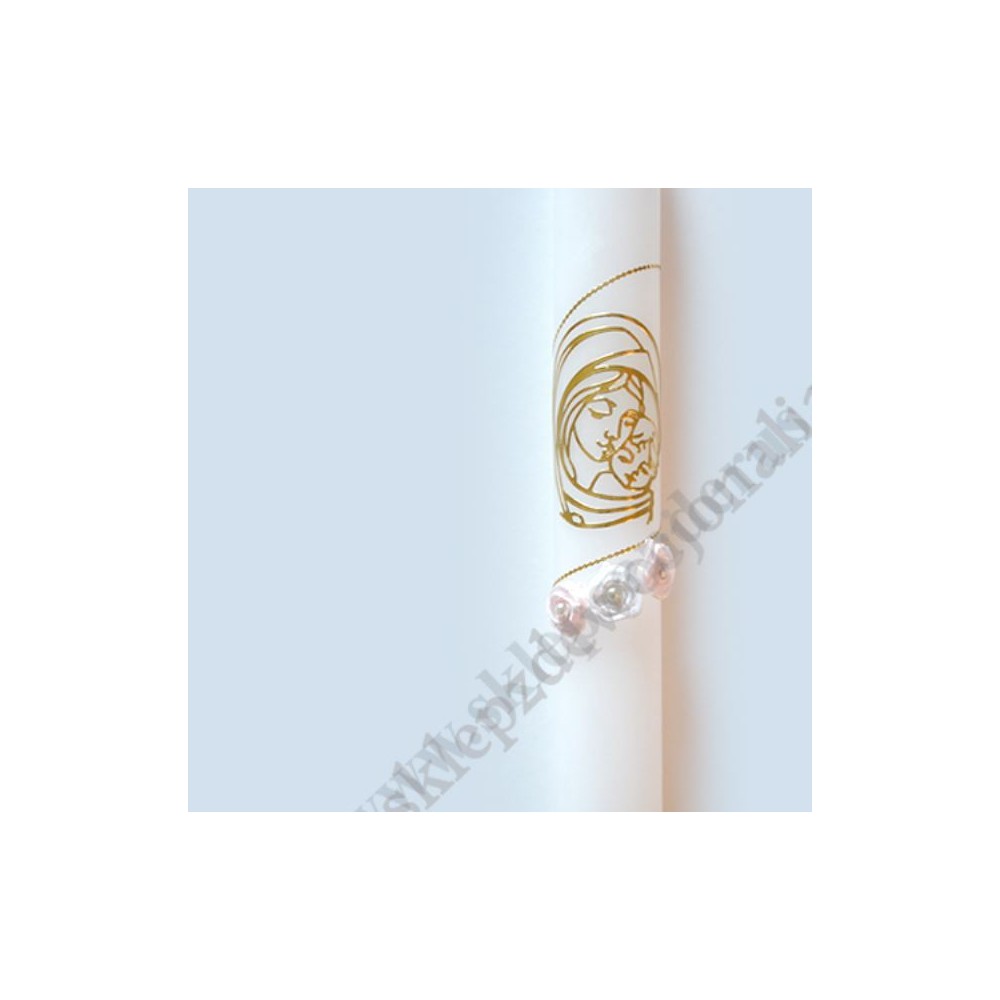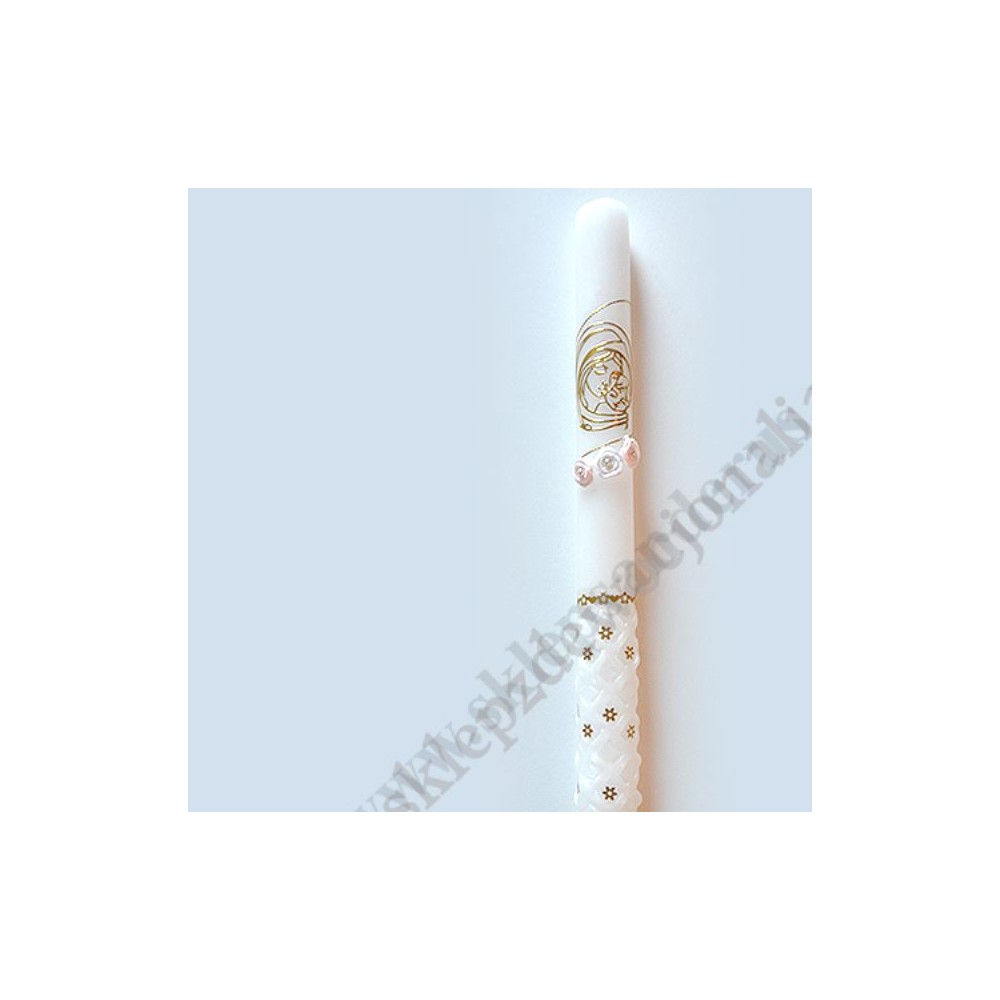 Świeca do chrztu, zdobienia w kolorze złotym, białym i różowym, parafinowa o długości 42 cm i średnicy 3 cm, zapakowana w kartonowe pudełko, do zestawu dołączone są literki pozwalające na wypisanie imienia dziecka oraz np. daty chrztu świętego.
