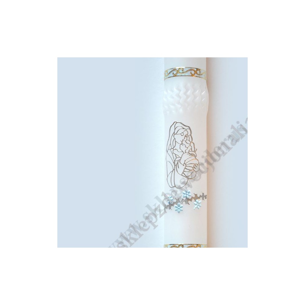 Świeca do chrztu, zdobienia w kolorze złotym, srebrnym i niebieskim, parafinowa o długości 42 cm i średnicy 3 cm, zapakowana w kartonowe pudełko, do zestawu dołączone są literki pozwalające na wypisanie imienia dziecka oraz np. daty chrztu świętego.