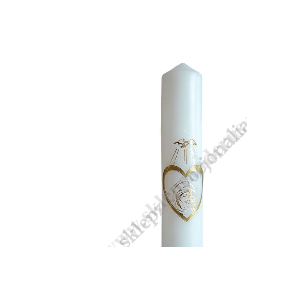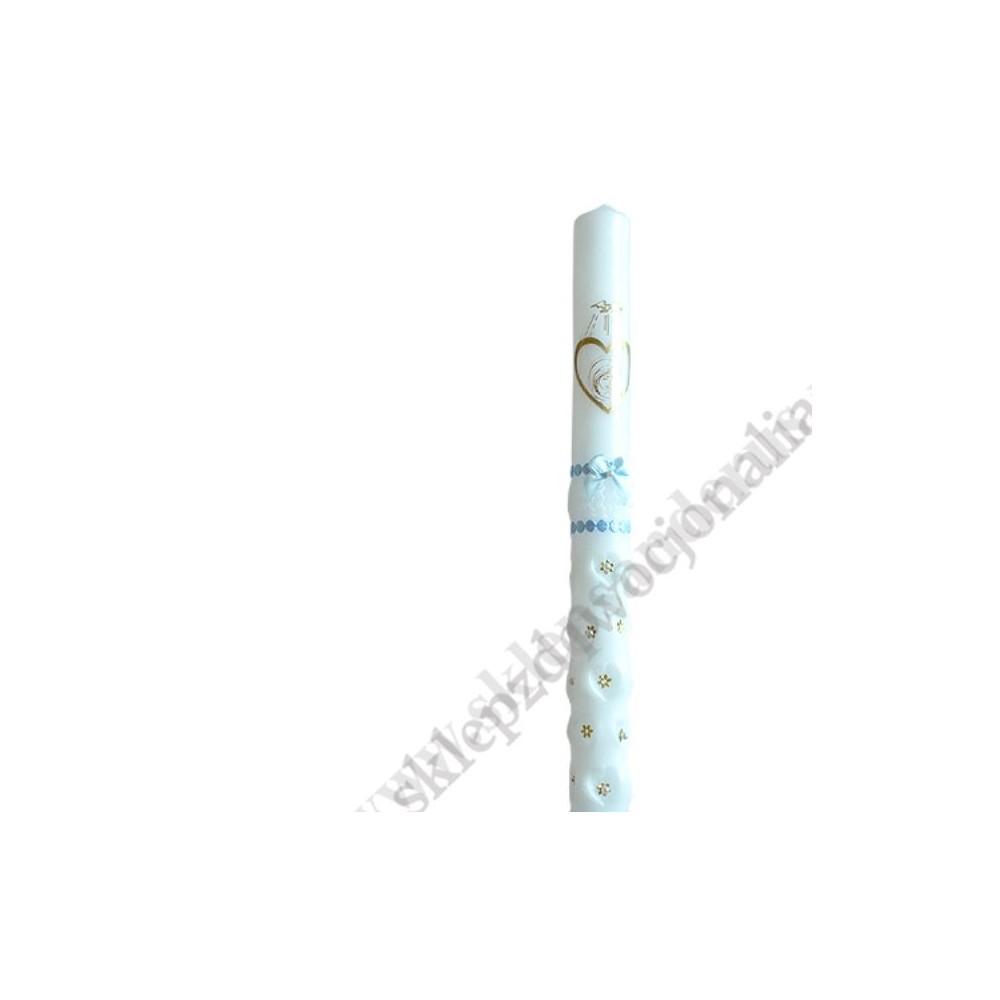 Świeca do chrztu, zdobienia w kolorze złotym i niebieskim, parafinowa o długości 42 cm i średnicy 3 cm, zapakowana w kartonowe pudełko, do zestawu dołączone są literki pozwalające na wypisanie imienia dziecka oraz np. daty chrztu świętego.