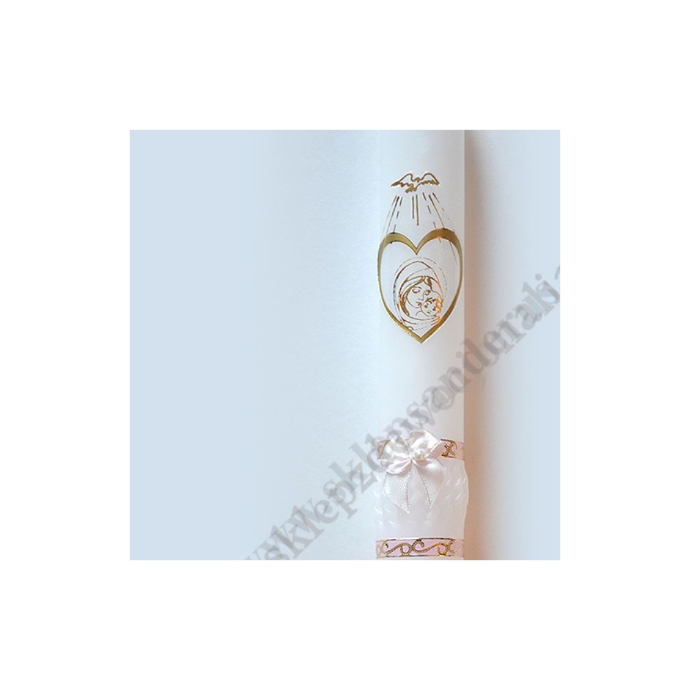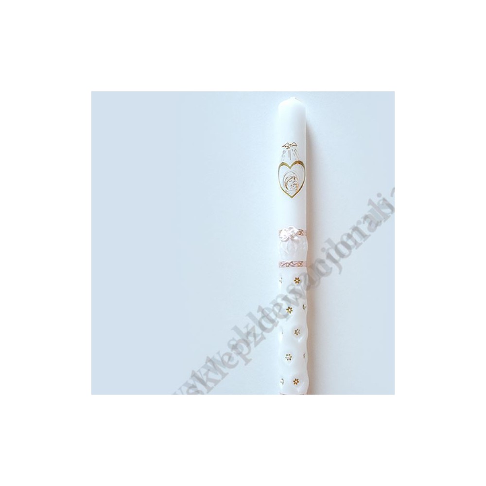 Świeca do chrztu, zdobienia w kolorze różowym i białym, parafinowa o długości 42 cm i średnicy 3 cm, zapakowana w kartonowe pudełko, do zestawu dołączone są literki pozwalające na wypisanie imienia dziecka oraz np. daty chrztu świętego.