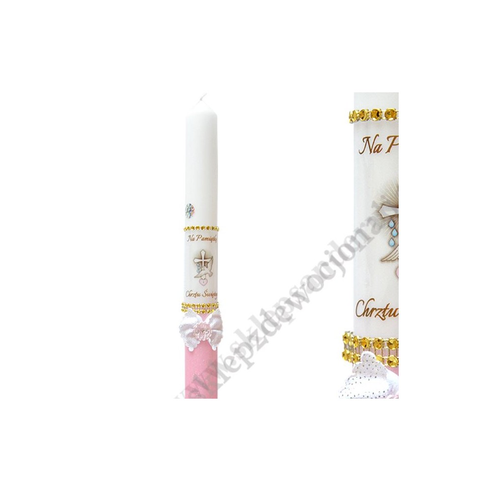 Świeca do chrztu o wysokości 40 cm i średnicy 3.3 cm. Dołączone są literki pozwalające na wypisanie imienia dziecka oraz np. daty Chrztu Świętego.