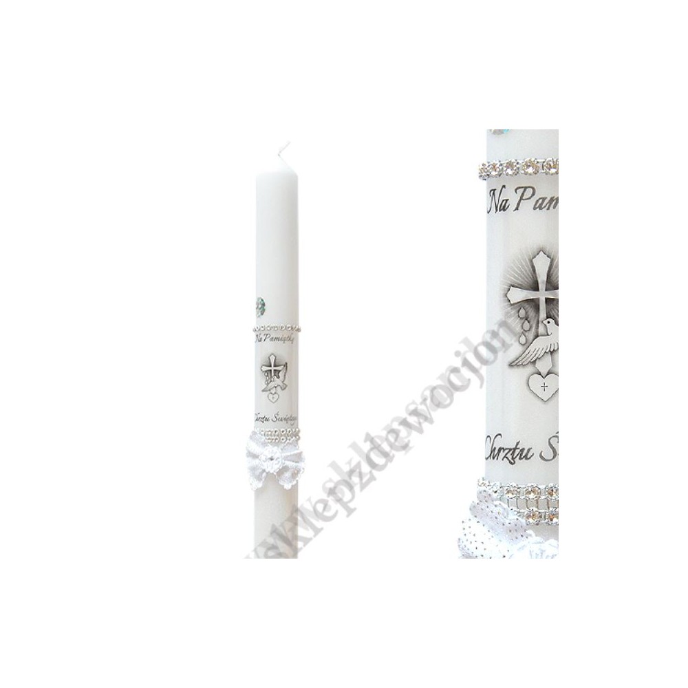 Świeca do chrztu o wysokości 40 cm i średnicy 3.3 cm. Dołączone są literki pozwalające na wypisanie imienia dziecka oraz np. daty Chrztu Świętego.