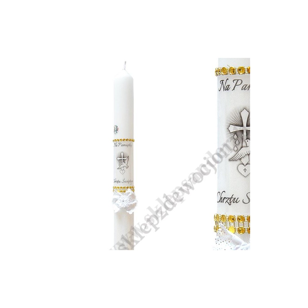Świeca do chrztu o wysokości 40 cm i średnicy 3.3 cm. Dołączone są literki pozwalające na wypisanie imienia dziecka oraz np. daty Chrztu Świętego.