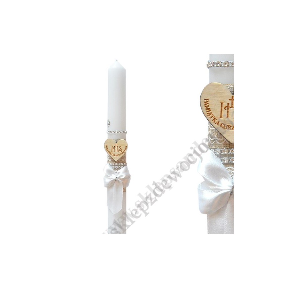Świeca do chrztu o wysokości 40 cm i średnicy 3.3 cm. Dołączone są literki pozwalające na wypisanie imienia dziecka oraz np. daty Chrztu Świętego.