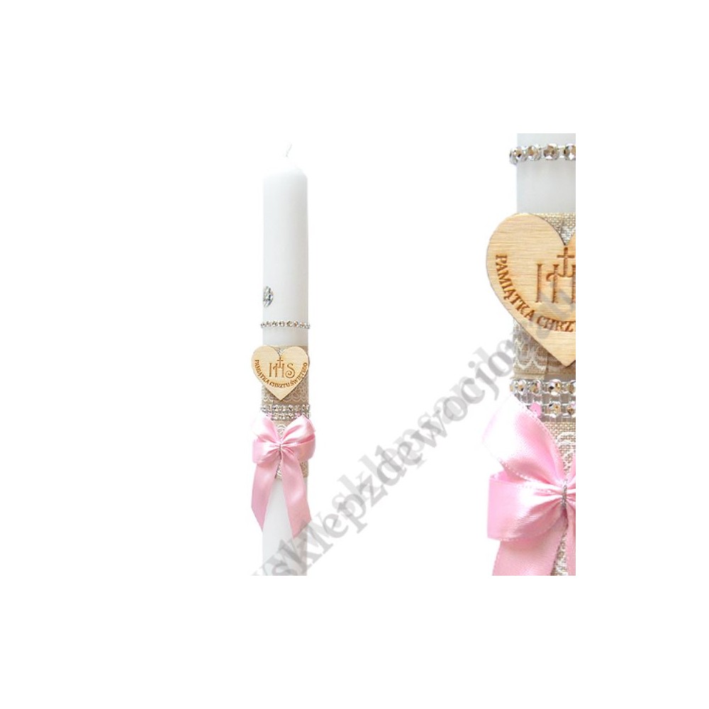 Świeca do chrztu o wysokości 40 cm i średnicy 3.3 cm. Dołączone są literki pozwalające na wypisanie imienia dziecka oraz np. daty Chrztu Świętego.