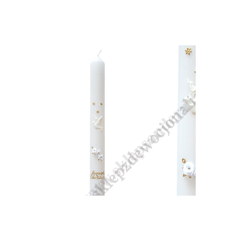 Świeca do chrztu o wysokości 40 cm i średnicy 3.3 cm. Dołączone są literki pozwalające na wypisanie imienia dziecka oraz np. daty Chrztu Świętego.