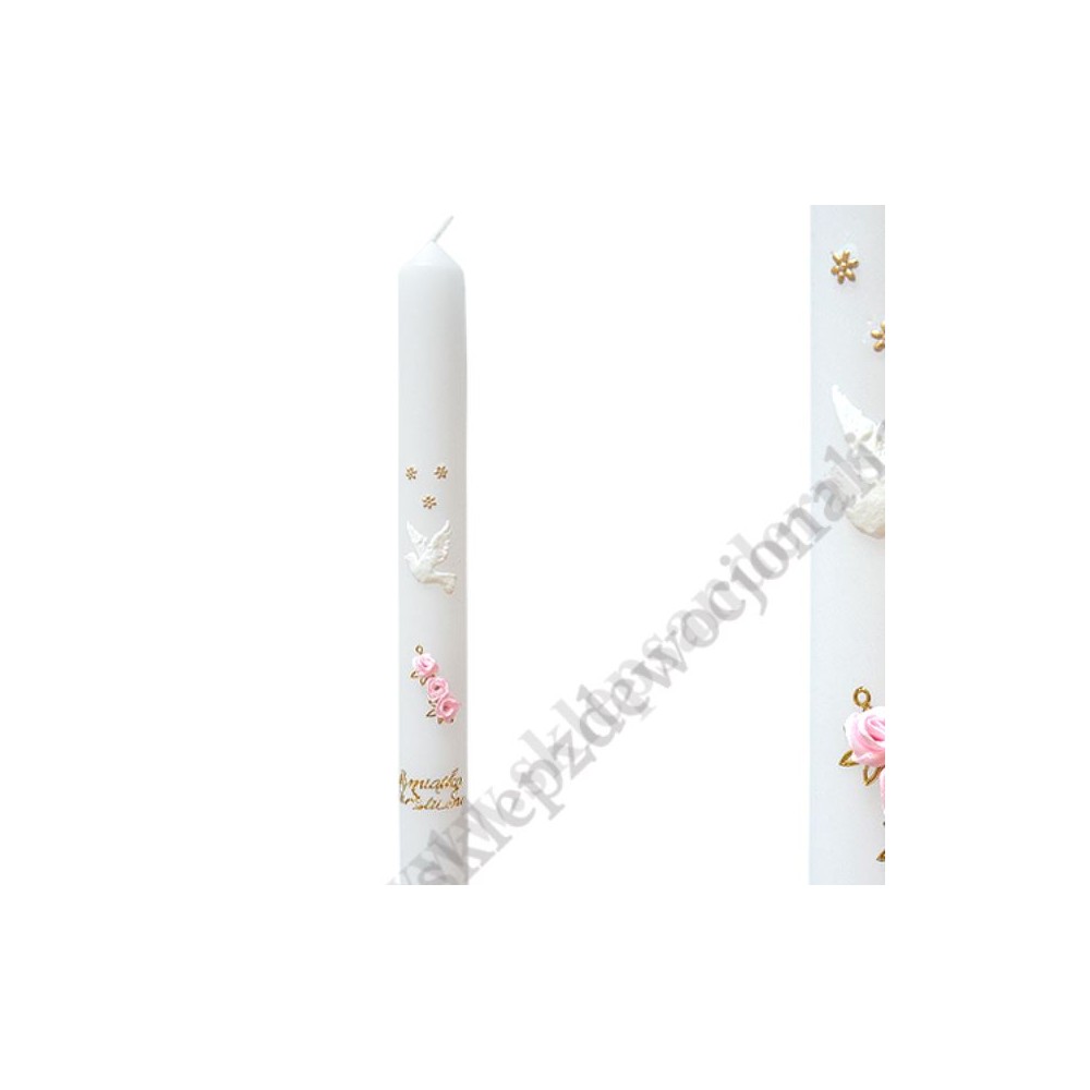 Świeca do chrztu o wysokości 40 cm i średnicy 3.3 cm. Dołączone są literki pozwalające na wypisanie imienia dziecka oraz np. daty Chrztu Świętego.