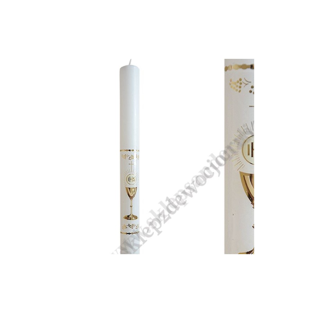 Świeca do chrztu zdobiona naklejkami z motywem chrzcielnym. Wysokość świecy 40 cm, średnica świecy 3.2 cm.