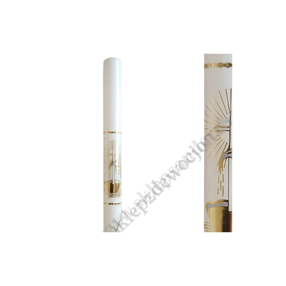 Świeca do chrztu zdobiona naklejkami z motywem chrzcielnym. Wysokość świecy 40 cm, średnica świecy 3.2 cm.