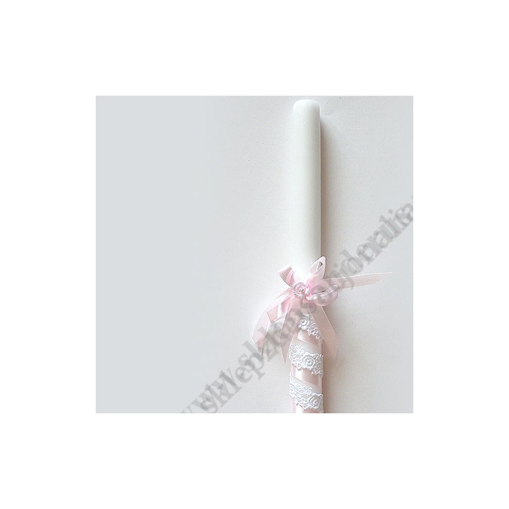 Świeca do chrztu o długości 40 cm i średnicy 3 cm zdobiona wstążką z kokardką.