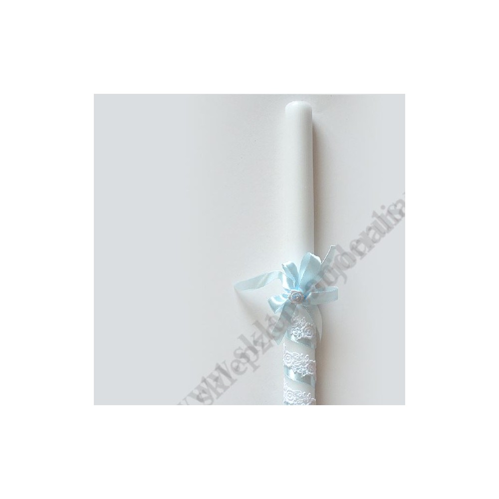 Świeca do chrztu o długości 40 cm i średnicy 3 cm zdobiona wstążką z kokardką.