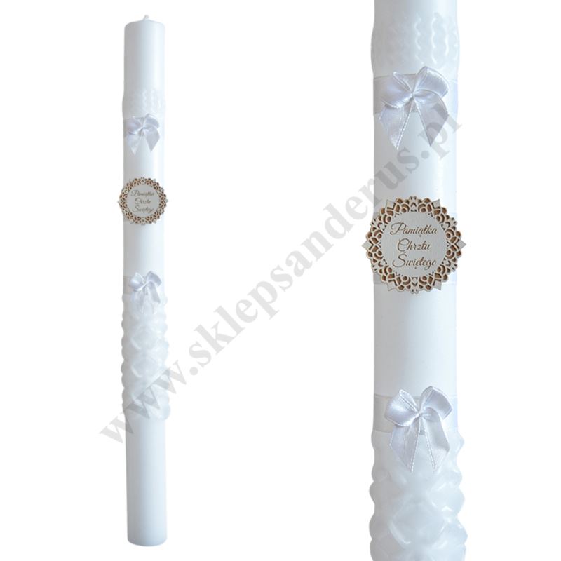 Świeca do chrztu ręcznie zdobiona o długości 38 cm i średnicy 3 cm. Zapakowana w kartonowe pudełko.