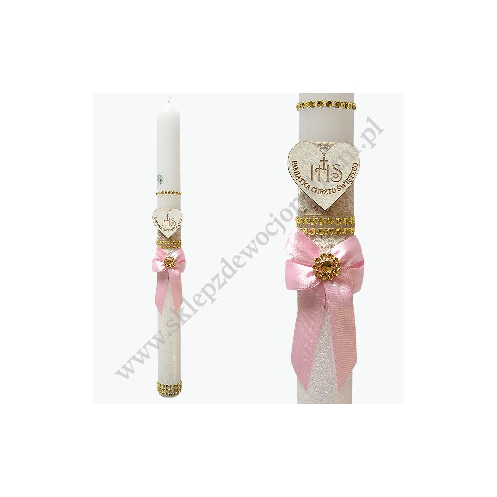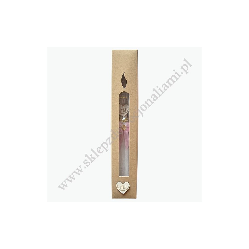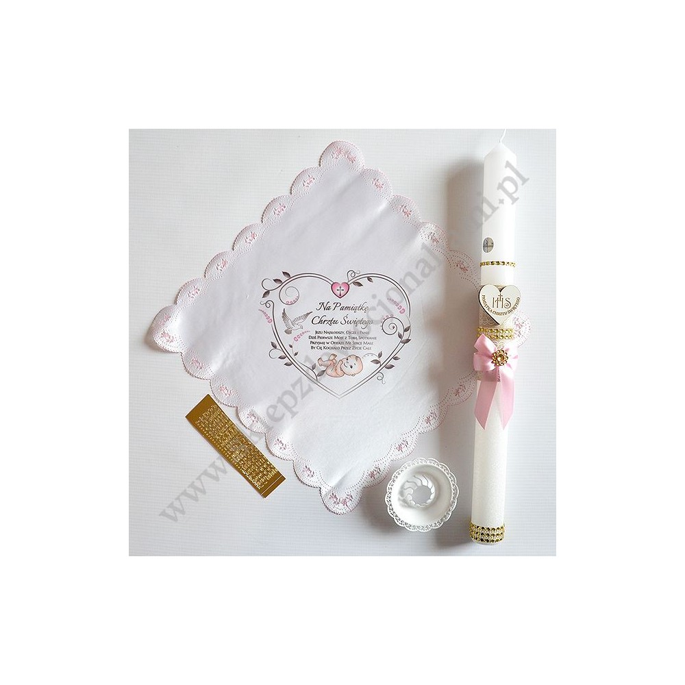 Zestaw do Chrztu Świętego zapakowany w eleganckie kartonowe pudełeczko zawierający świecę do chrztu, okapnik do świecy oraz szatkę do chrztu. Wysokość świecy 40 cm, średnica świecy 3.3 cm. Dołączone są literki pozwalające na wypisanie imienia dziecka...