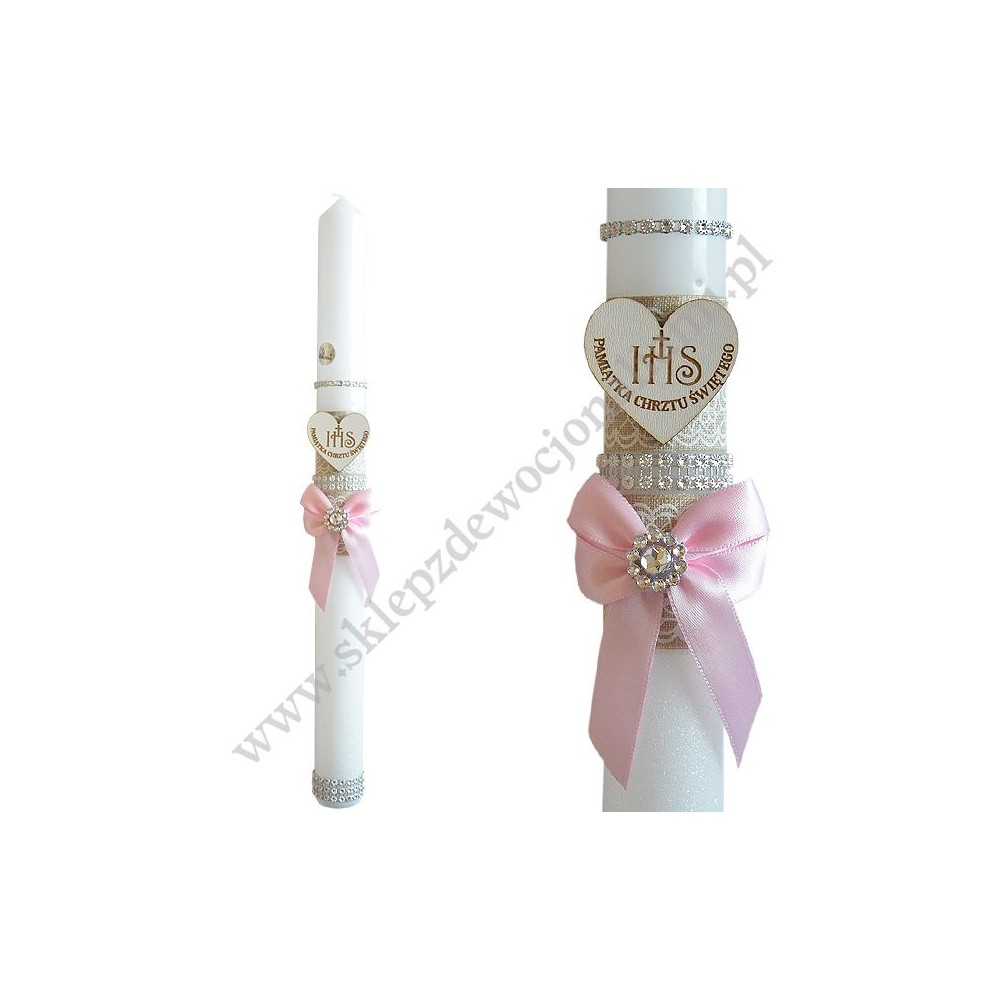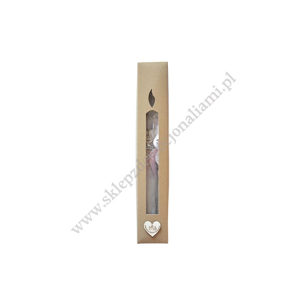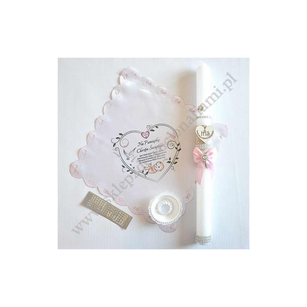Zestaw do Chrztu Świętego zapakowany w eleganckie kartonowe pudełeczko zawierający świecę do chrztu, okapnik do świecy oraz szatkę do chrztu. Wysokość świecy 40 cm, średnica świecy 3.3 cm.