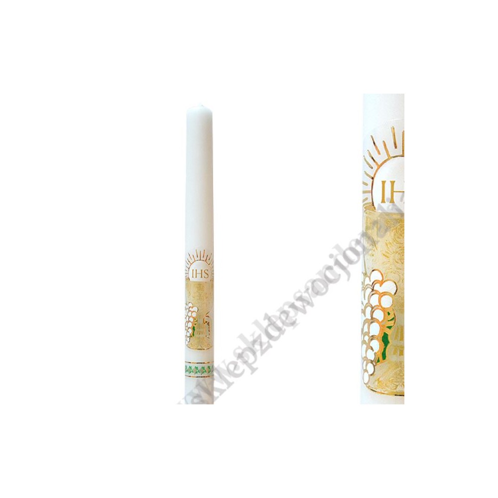 Świeca komunijna o wysokości 40 cm i średnicy 3 cm, zdobiona naklejką.
