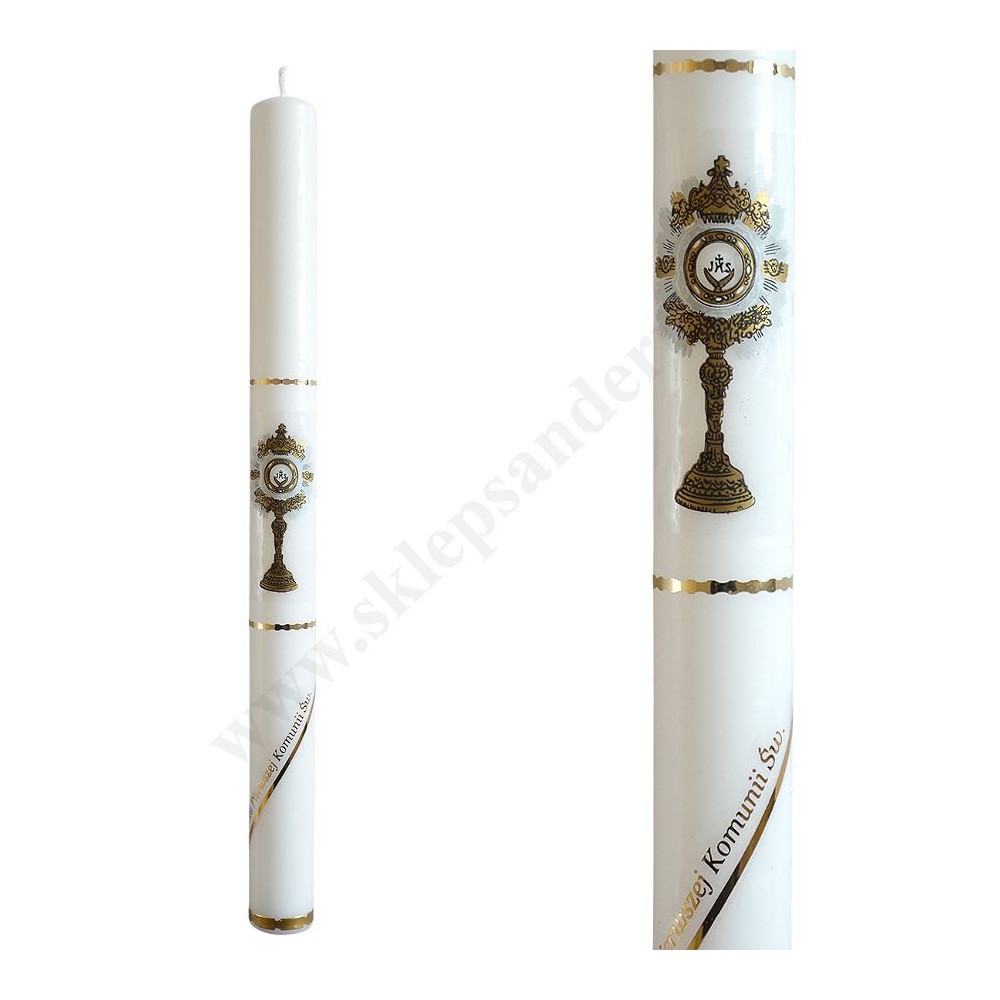 Świeca komunijna o wysokości 39 cm i średnicy 3.1 cm zdobiona eucharystycznymi naklejkami.