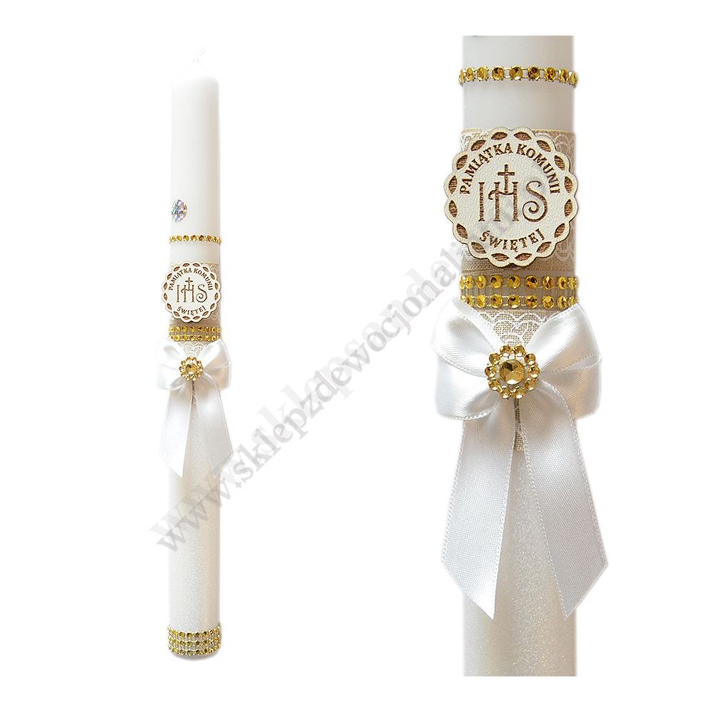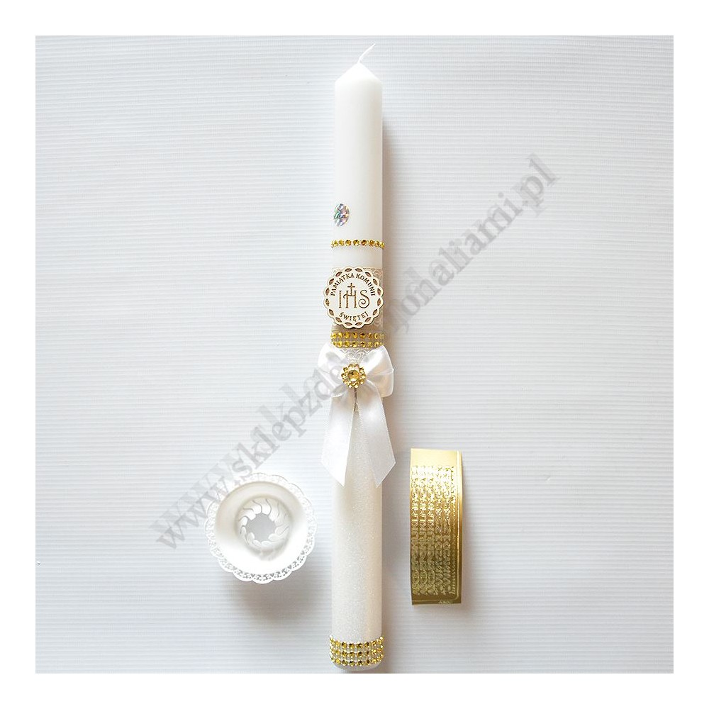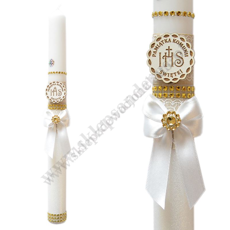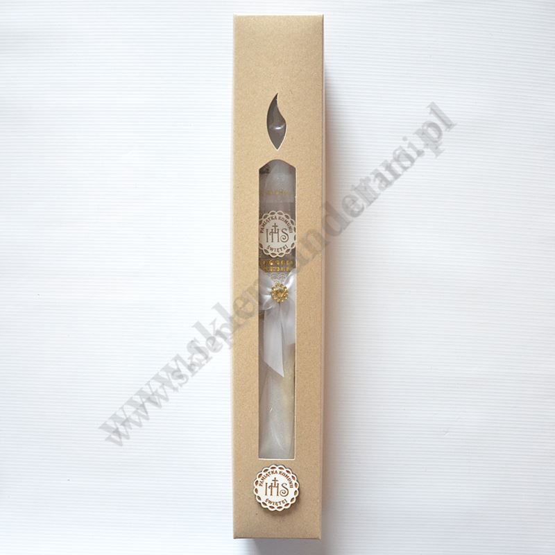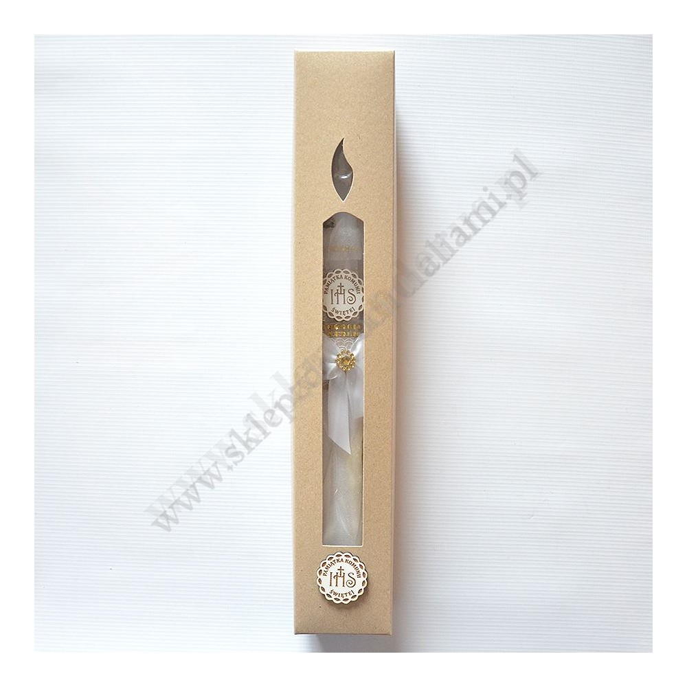 Świeca komunijna o wysokości 40 cm i średnicy 3.3 cm, w komplecie z plastikowym okapnikiem i literkami do wypisana imienia i daty Komunii Świętej.