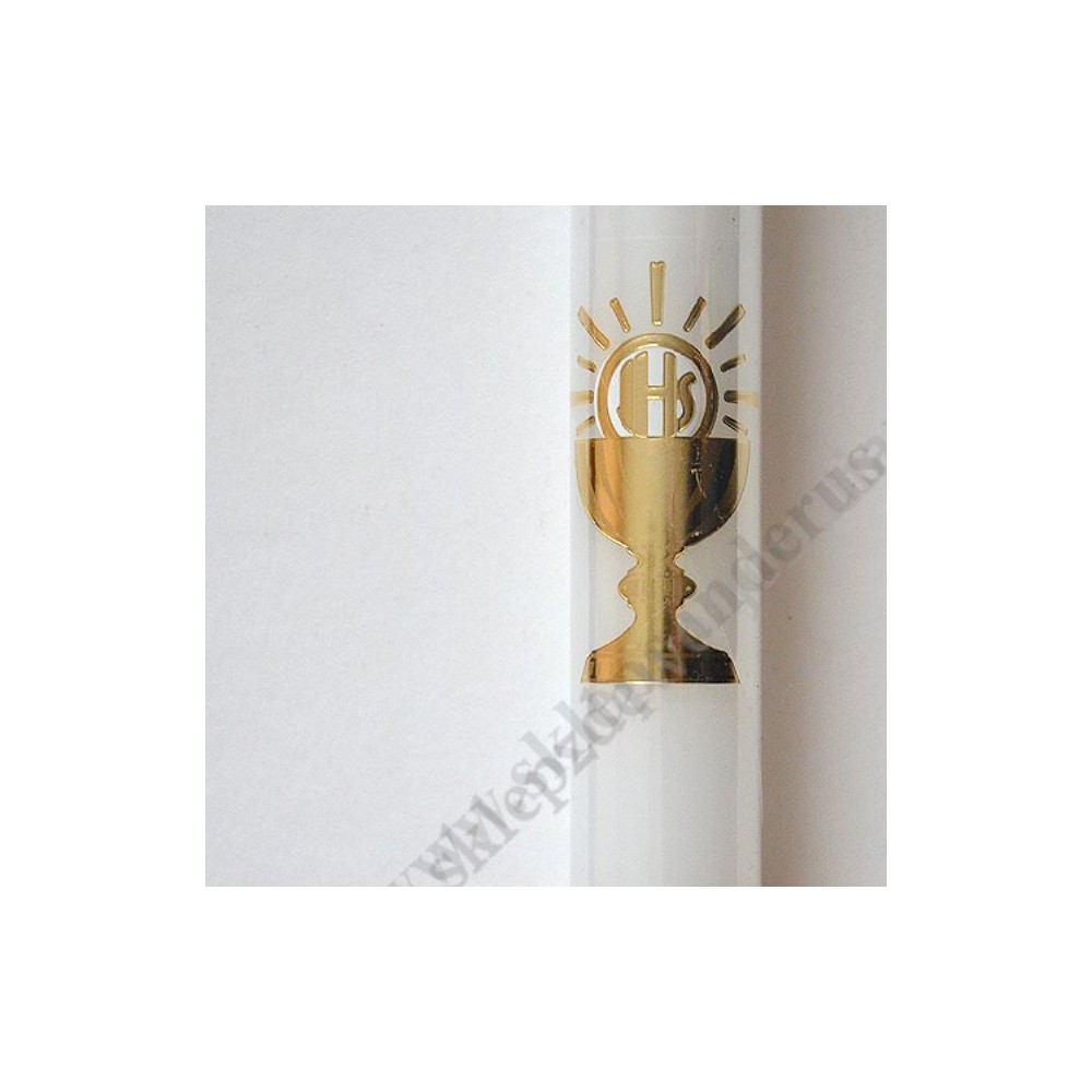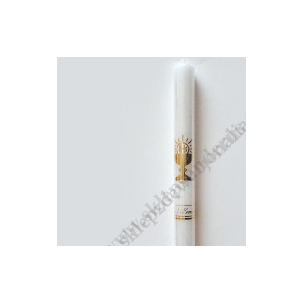Świeca komunijna zdobiona eucharystyczną naklejką o długości 40 cm i średnicy 3.5 cm.