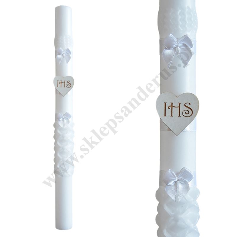 Świeca komunijna ręcznie zdobiona o długości 38 cm i średnicy 3 cm. Zapakowana w kartonowe pudełko.