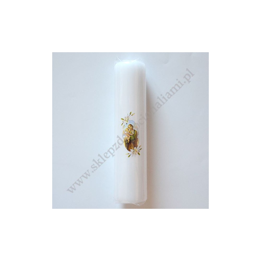 Świeca z wizerunkiem Świętego Józefa o wysokości 20 cm i średnicy 5 cm.
