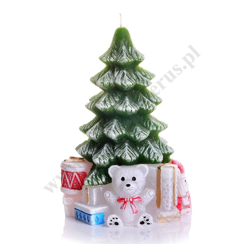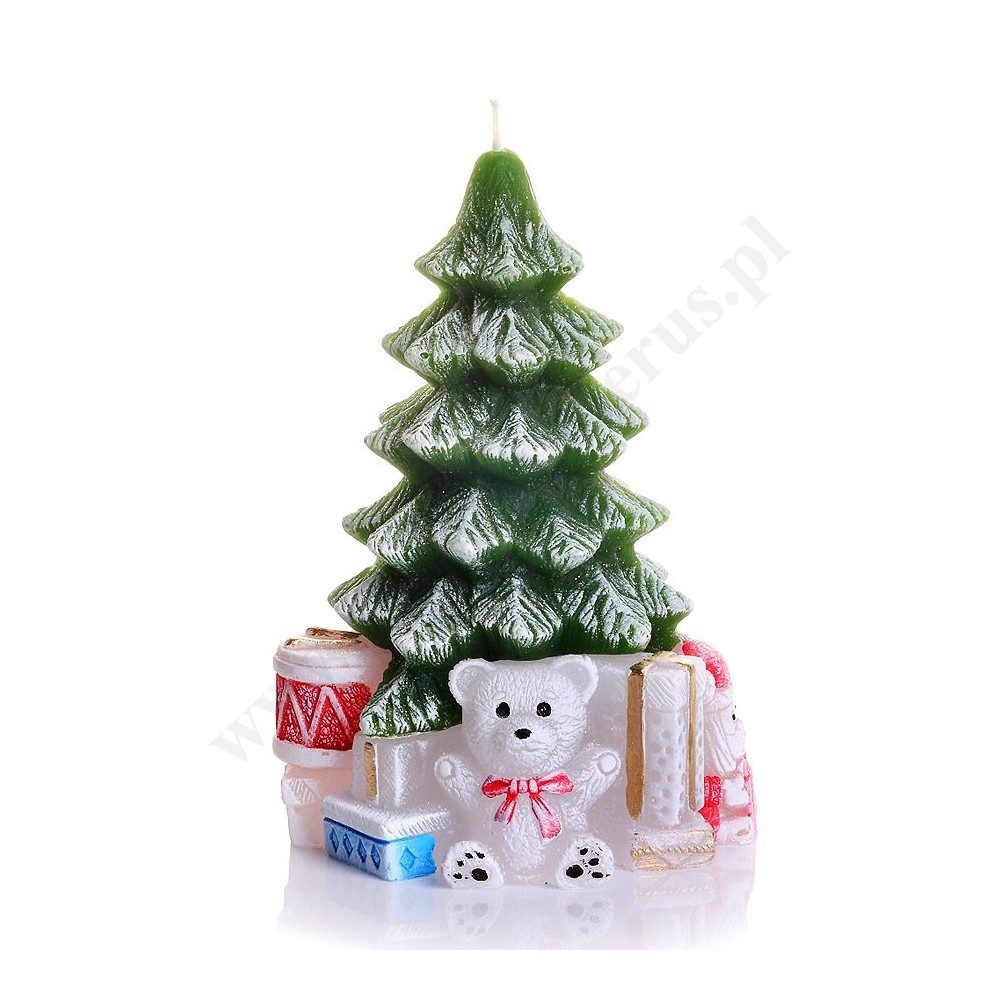 Świeca bożonarodzeniowa w formie choinki o wysokości 15 cm i szerokości 10 cm.