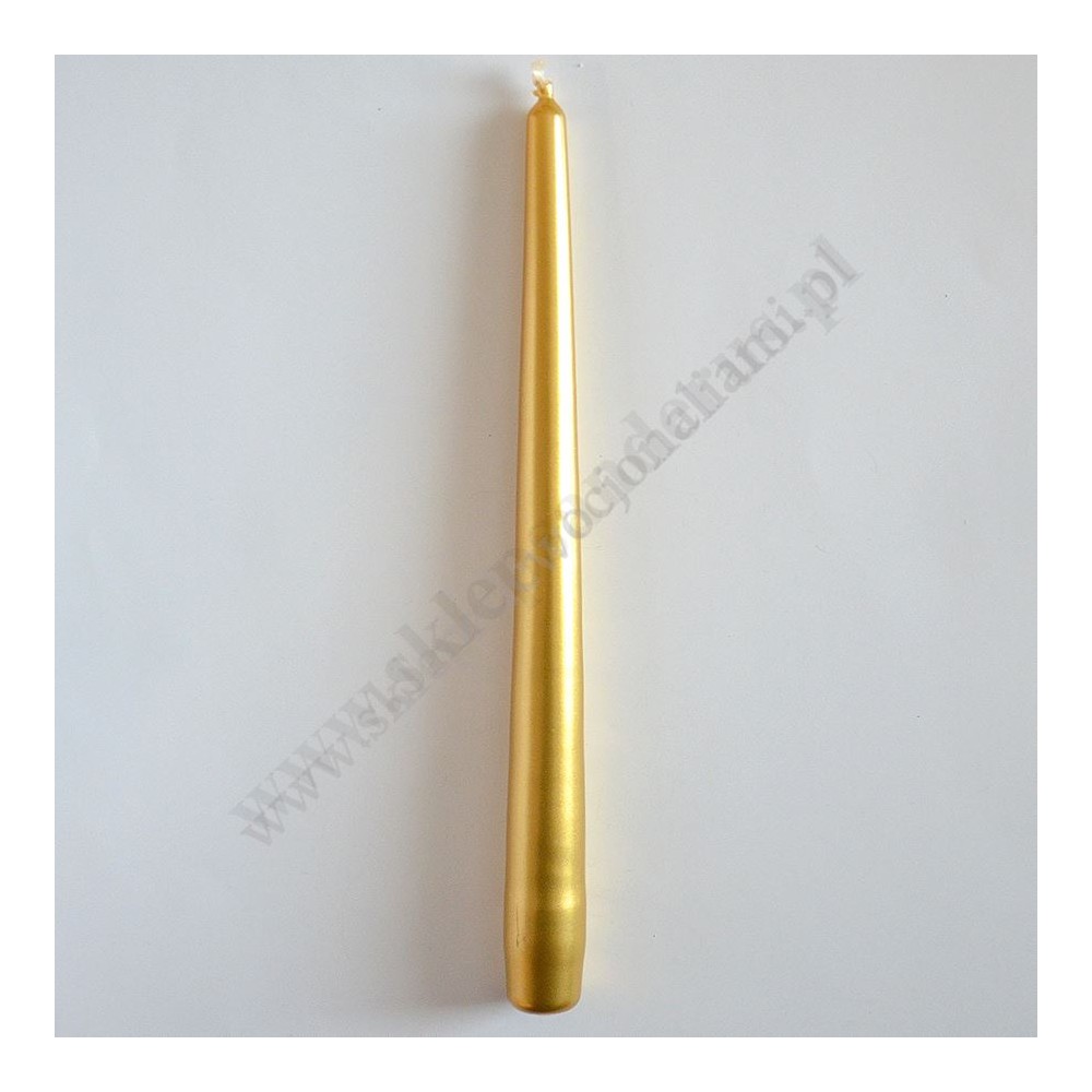 Świeca stożek metalik złoty o wysokości 24 cm.