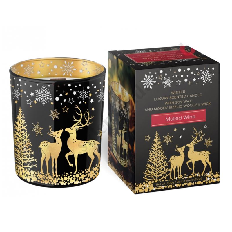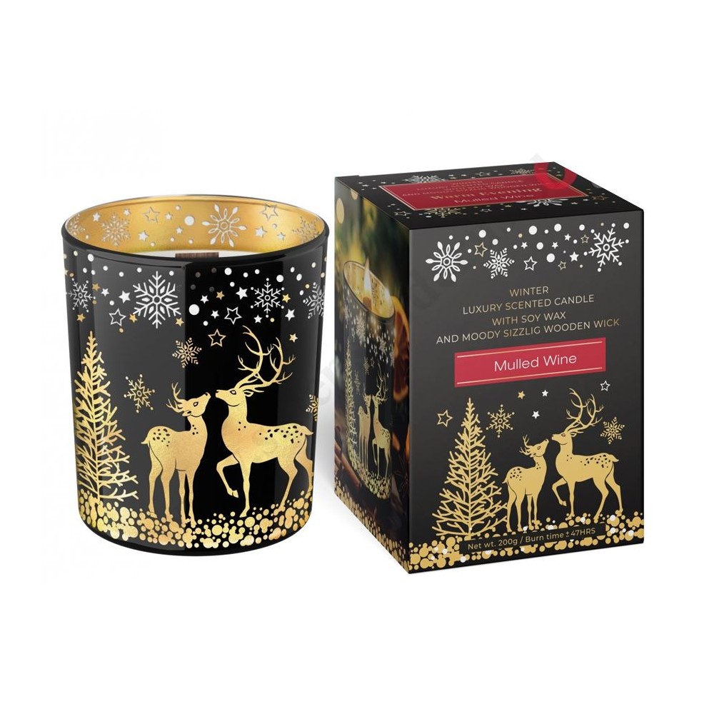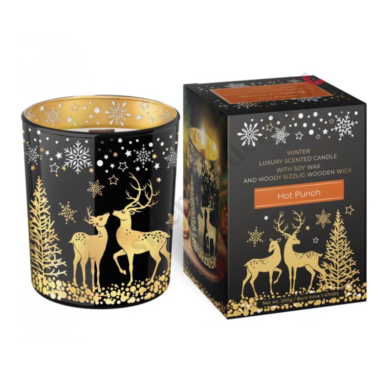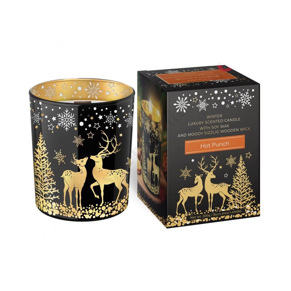 Świeca zapachowa w zdobionym szkle o wysokości 10 cm o średnicy 8.7 cm. Czas palenia 47 godzin. Dostępne dwa rodzaje świec - Hot Punch oraz Mulled Wine.