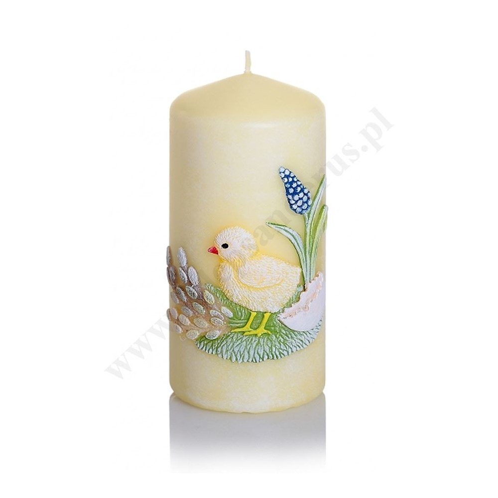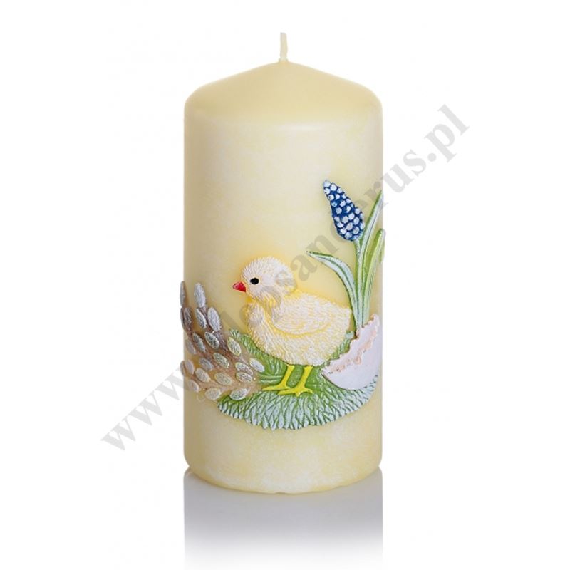 Świeca słupek zdobiona aplikacją kurczaka o wysokości 12 cm i średnicy 6 cm.
